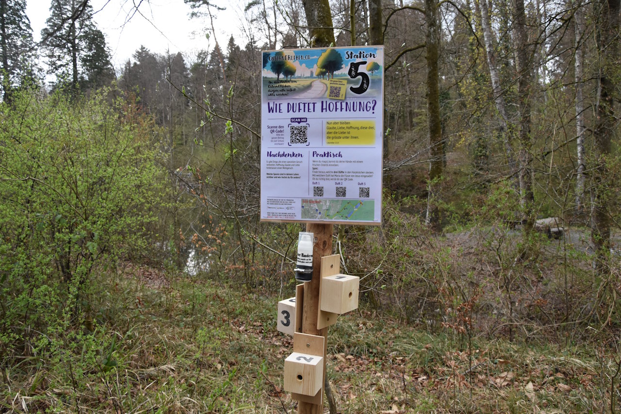 Ende November 2024 trafen sich Interessierte zum Ideenaustausch für einen neuen Weg. Seit Januar 2025 sind nun sieben Personen damit beschäftigt, das Resultat umzusetzen. Weil am alten Ort eine grosse Baustelle besteht, startet der neue Osterweg beim Friedhof Rosenberg und führt via Walchenweiher dorthin zurück. Er ist etwa zwei Kilometer lang und kinderwagentauglich, für Rollatoren sind die Waldwege weniger geeignet. «Man kann sich aber überall einklinken – die Pfosten der sieben Stationen sind von weitem erkennbar», betont Christoph Grob. Man sollte das Smartphone mitnehmen für die QR-Codes – es gibt etwas zu sehen, zu hören, zu riechen, Gedankenanstösse und konkrete Tipps, das Thema gleich umzusetzen. «Letztes Mal legten wir ein grosses Holzkreuz in den Wald», schaut Grob zurück. Wer wollte, konnte symbolisch für Wut, Trauer oder Abschiednehmen einen Nagel hineinschlagen: «Das Kreuz war am Schluss übersät damit…» Offenbar tat es vielen gut, ihr Unbehagen schlagkräftig auszudrücken – und damit loszulassen.